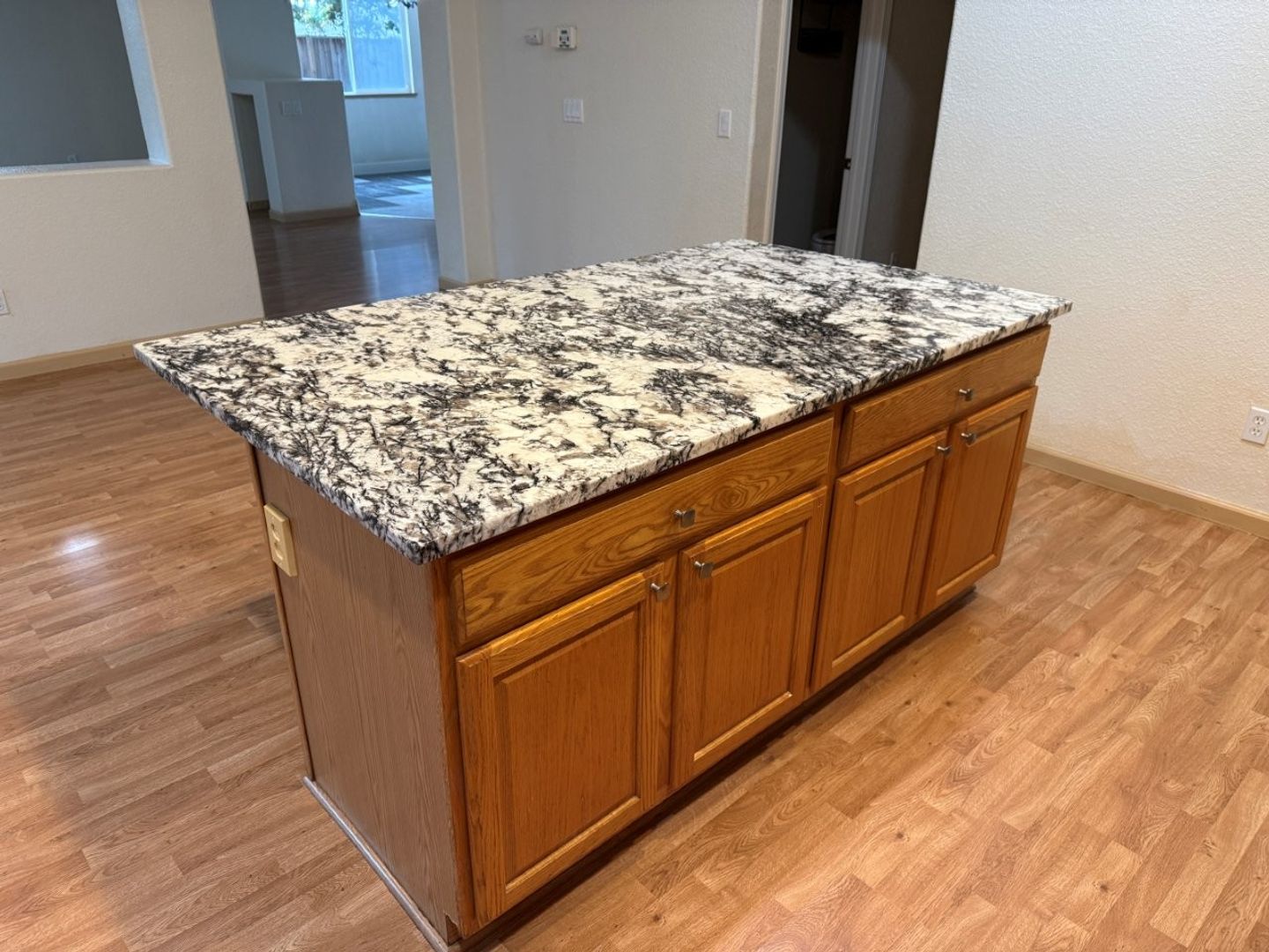 - Kitchen Features: Laminate Floors, Granite Countertops and Backsplash, Modern Cabinetry, Large Island, Double Stainless Sink w/ Pull Out Sprayer, Recessed Lights, Stainless Appliances, Newer Switches and Outlets, Gas Range w/ Newer Vent Hood, Double Oven, Dual Pane Window w/ Faux Wood Blind