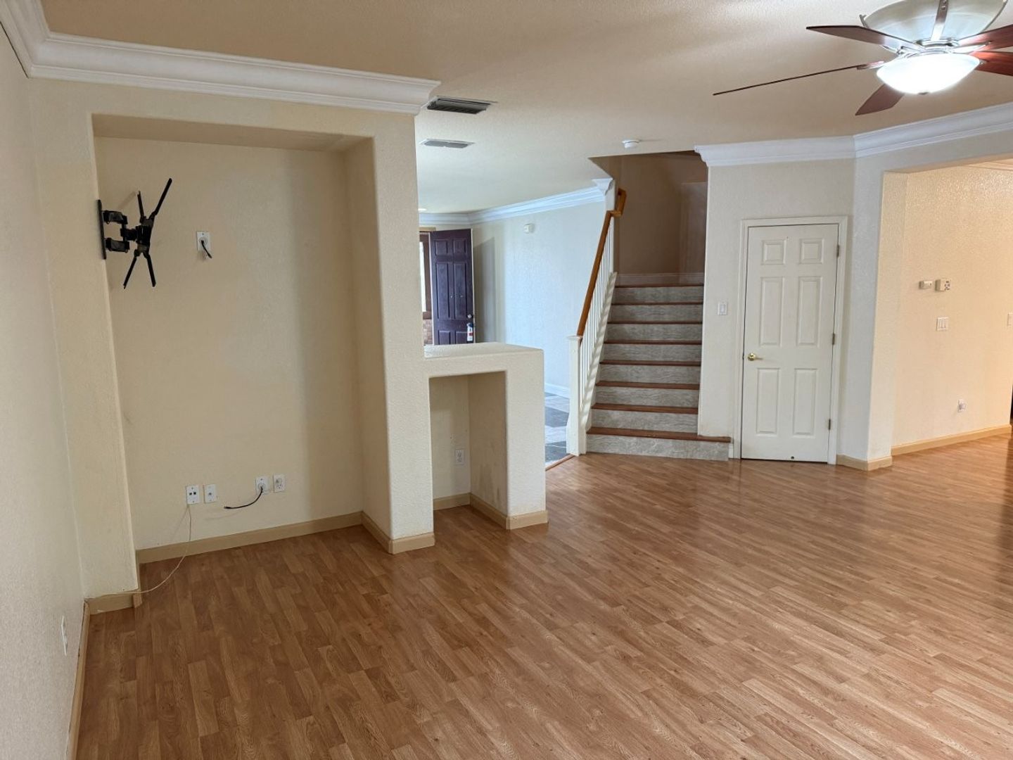 - Family Room Features: Laminate Floors, Tons of Dual Pane Windows, Ceiling Fan on Switches, Crown Molding, Built-In Outcoves w/ TV Mount, Wall w/ Open Area Looking into Kitchen