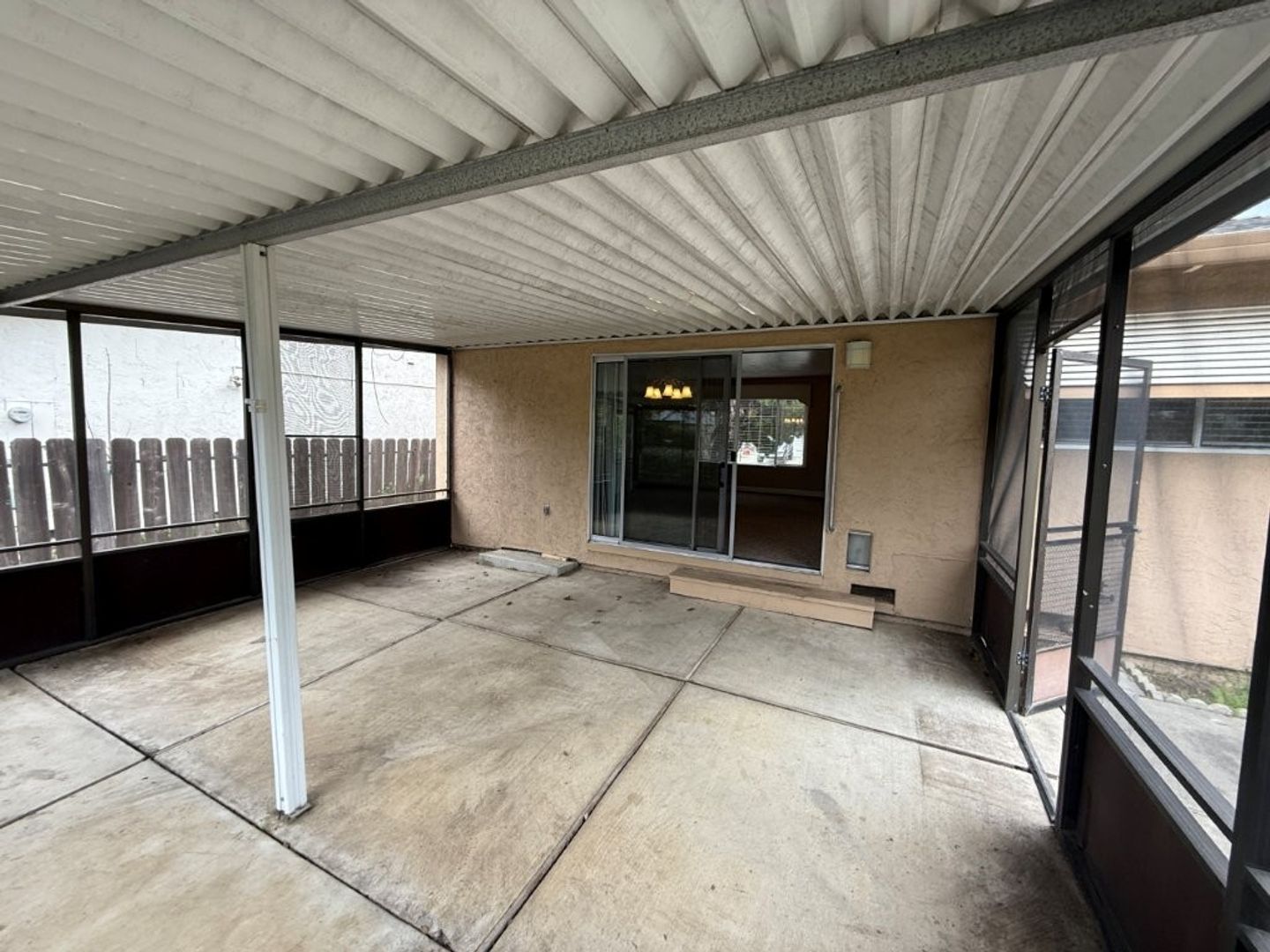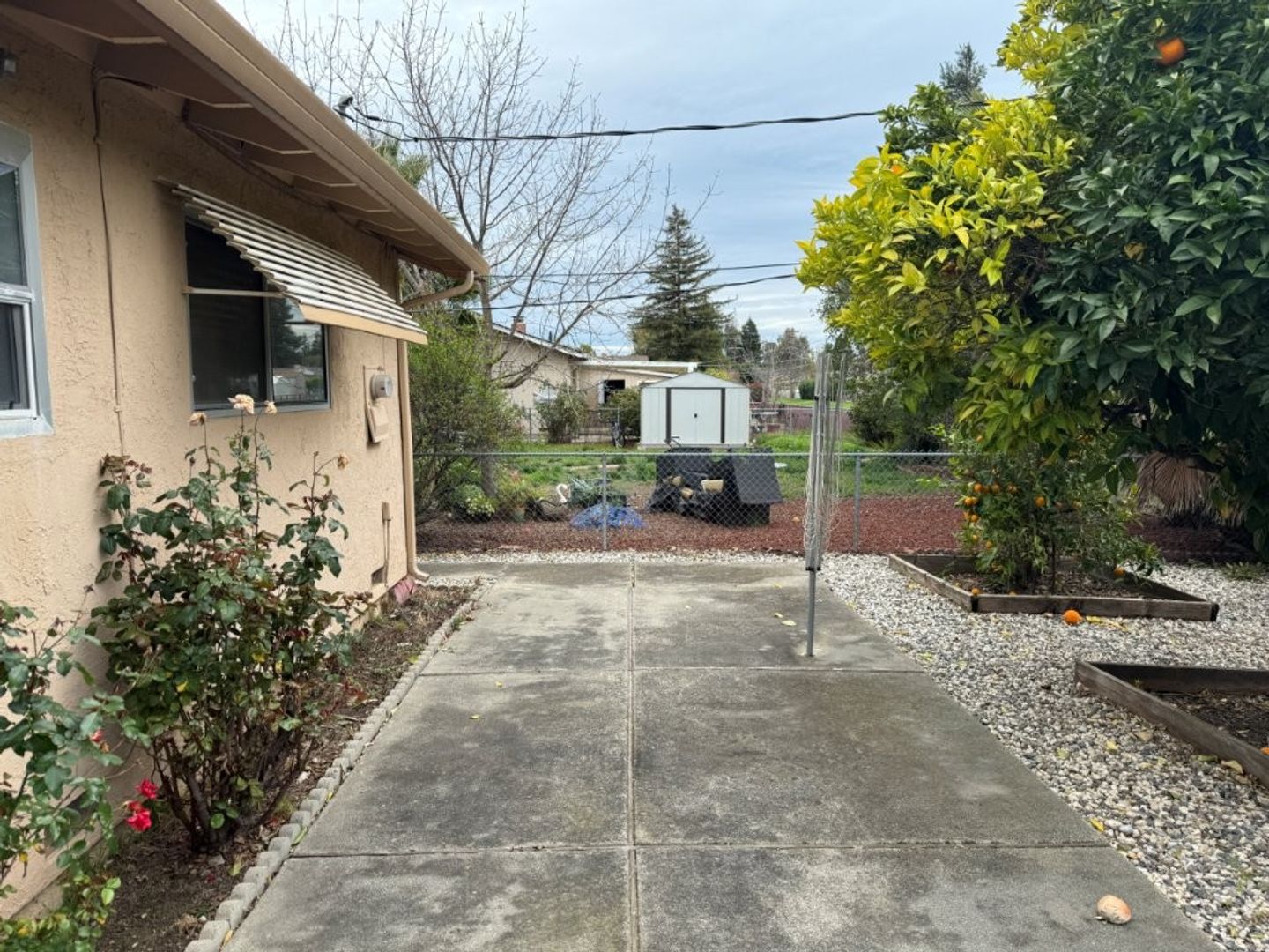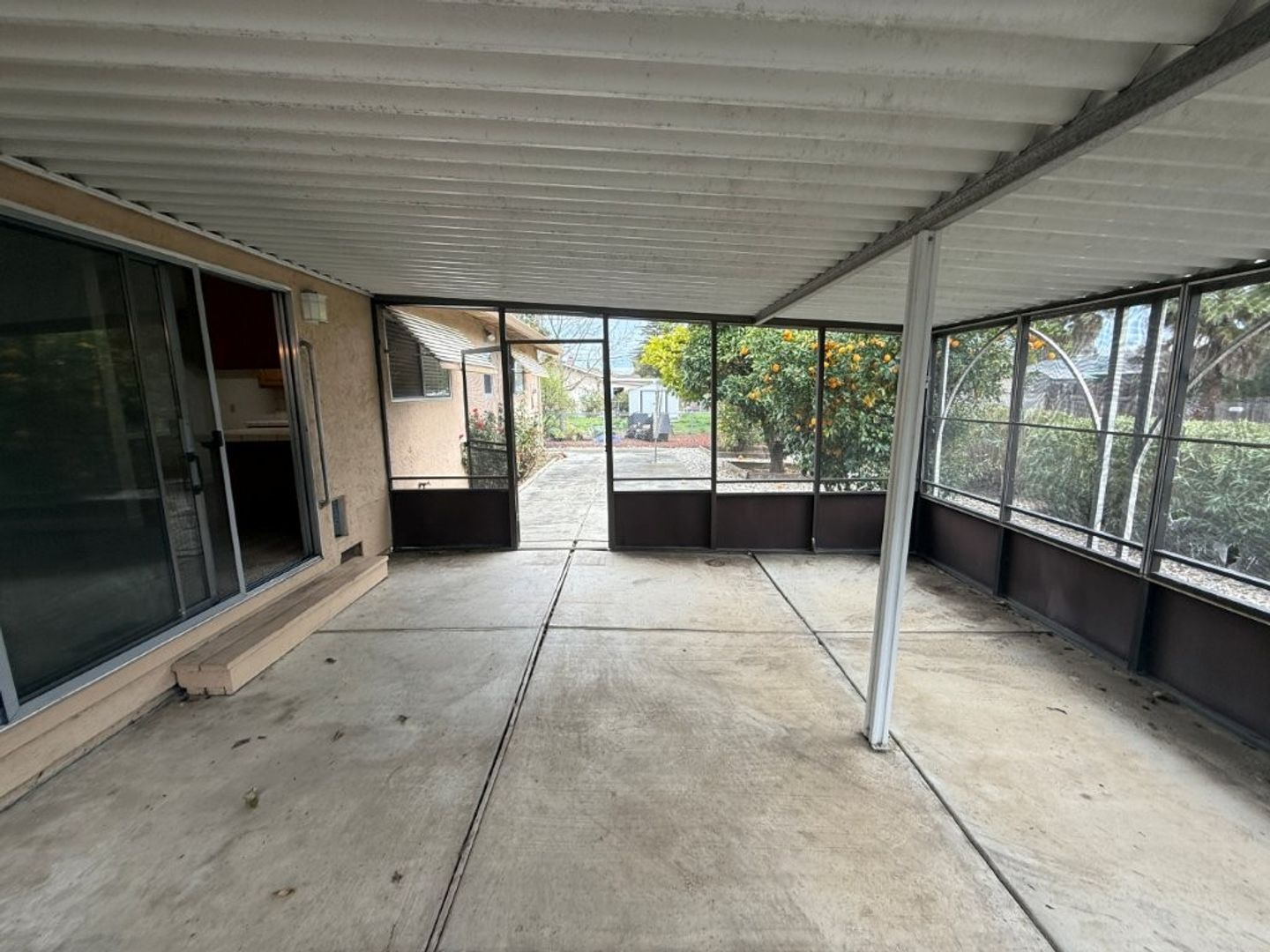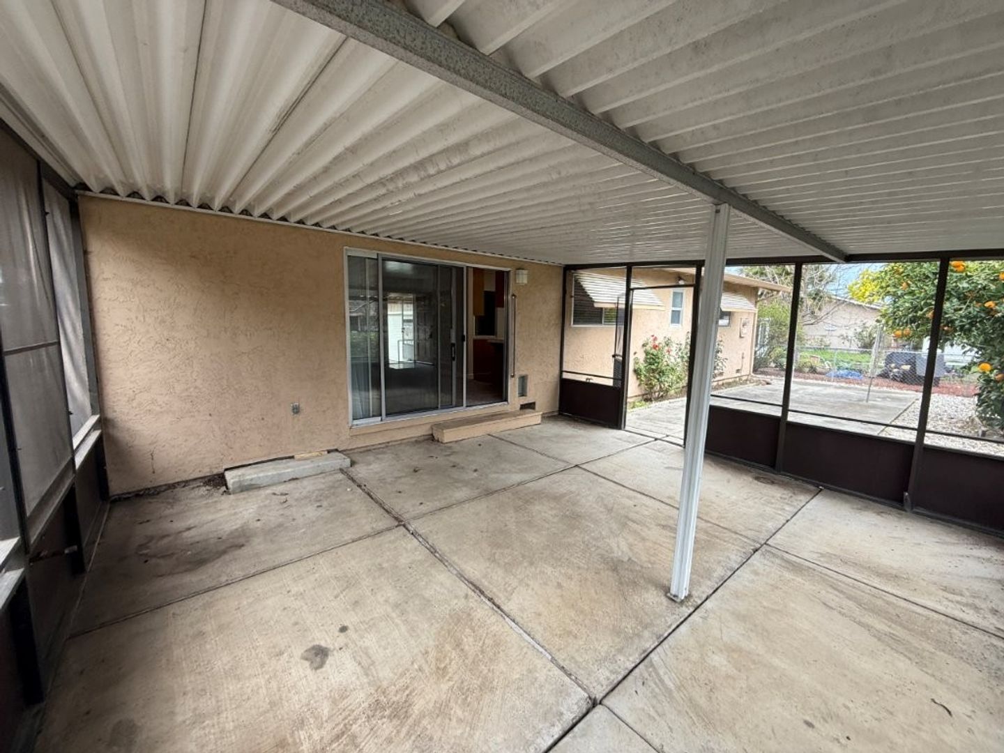- Backyard Features: Screened-in Covered Patio, Concrete Pads, Orange Trees, Rose Bushes, Oleanders Along Back Provide Privacy