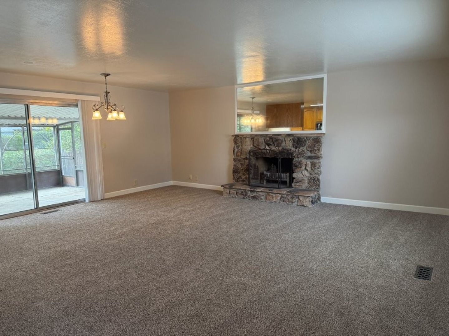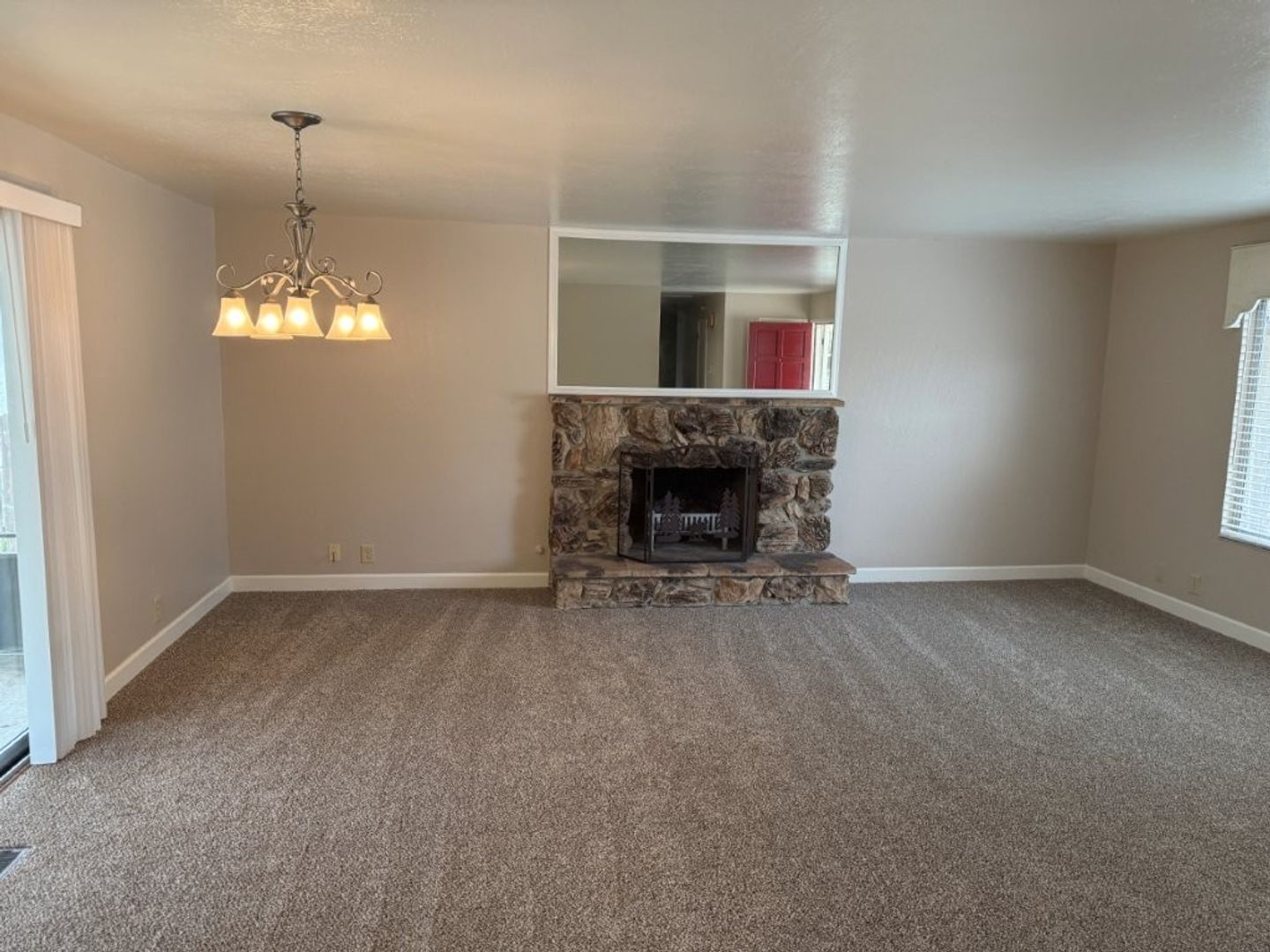 - Large Living/Dining Room Combo Features: New Carpet and Baseboards, New Paint, Faux Wood Blinds on Large Window, Rocked Wood Burning Fireplace w/ Large Mirror, Slider w/ Vertical Blinds, Modern Chandelier